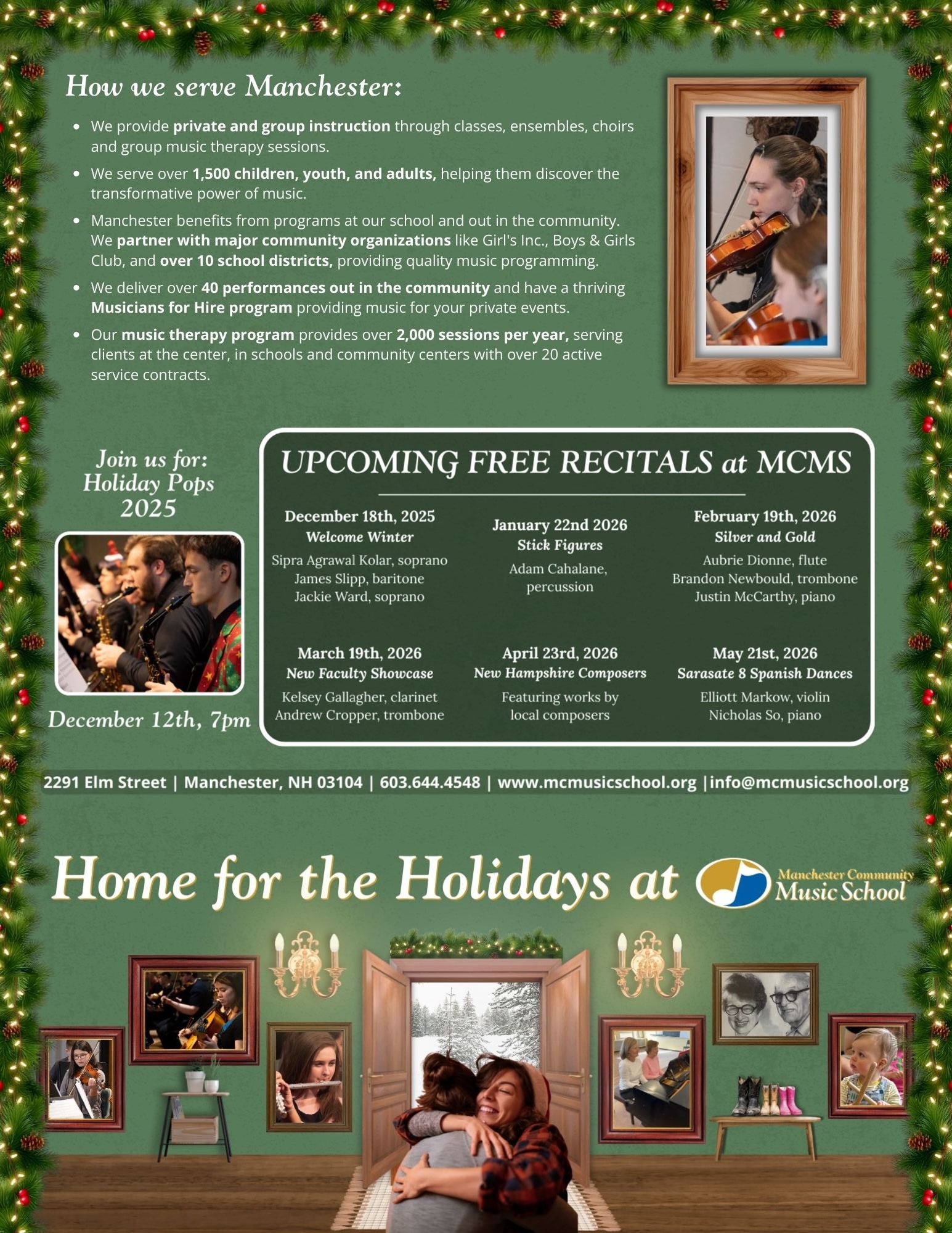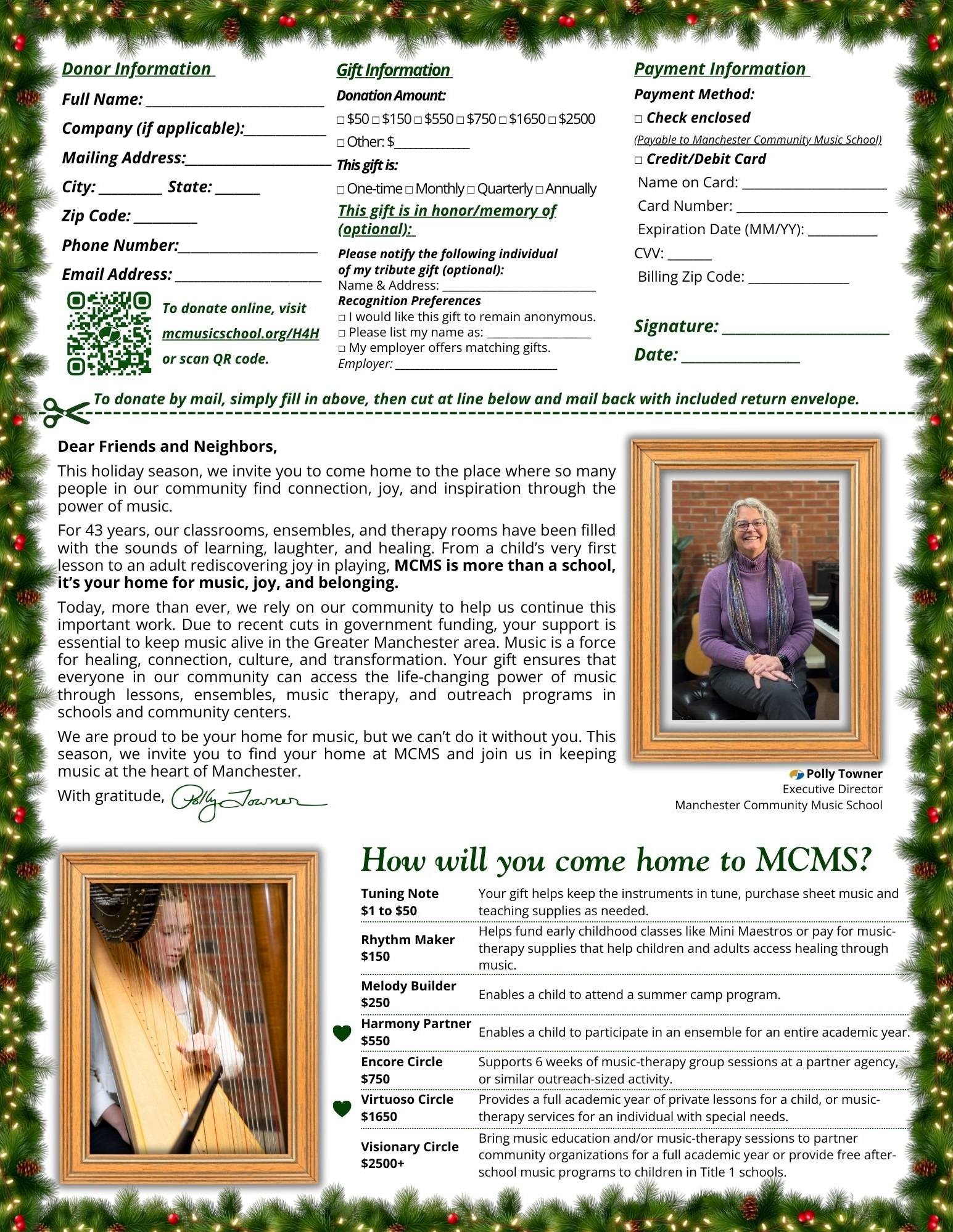 I designed a trifold direct mailer for Manchester Community Music School’s Home for the Holidays campaign, carefully structuring the layout to guide readers through the story, impact, and call to action. I created and refined the design using Adobe Illustrator for precise layout, typography, and print-ready formatting, and Canva for efficient collaboration and adaptation across campaign assets, ensuring visual consistency across both print and digital materials.